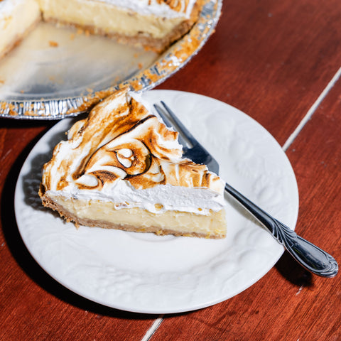 Freshly Squeezed Lemon Juice and Zest blended together and baked into a Custard Filling, Topped with a Toasted Meringue, all in a Graham Cracker Crust.